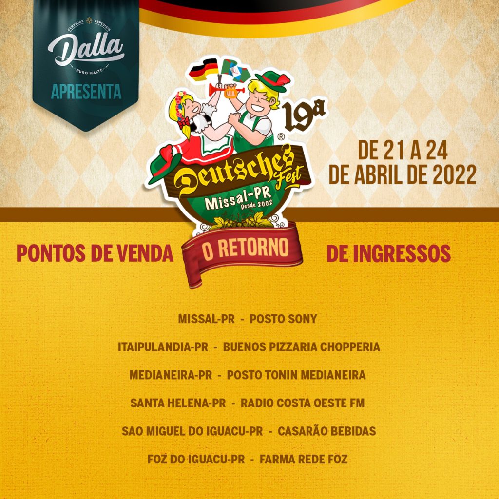 O município de Missal e a região vivem grande expectativa para o retorno da Maior Festa típica do Oeste do Paraná. A 19ª Deutsches Fest, neste ano terá um dia a mais de evento, portanto, 04 dias de muita alegria e diversão, previsto para 21 a 24 de abril de 2022. Mas, somente um destes dias terá cobrança de ingresso, que é o sábado, dia 23 de abril.
