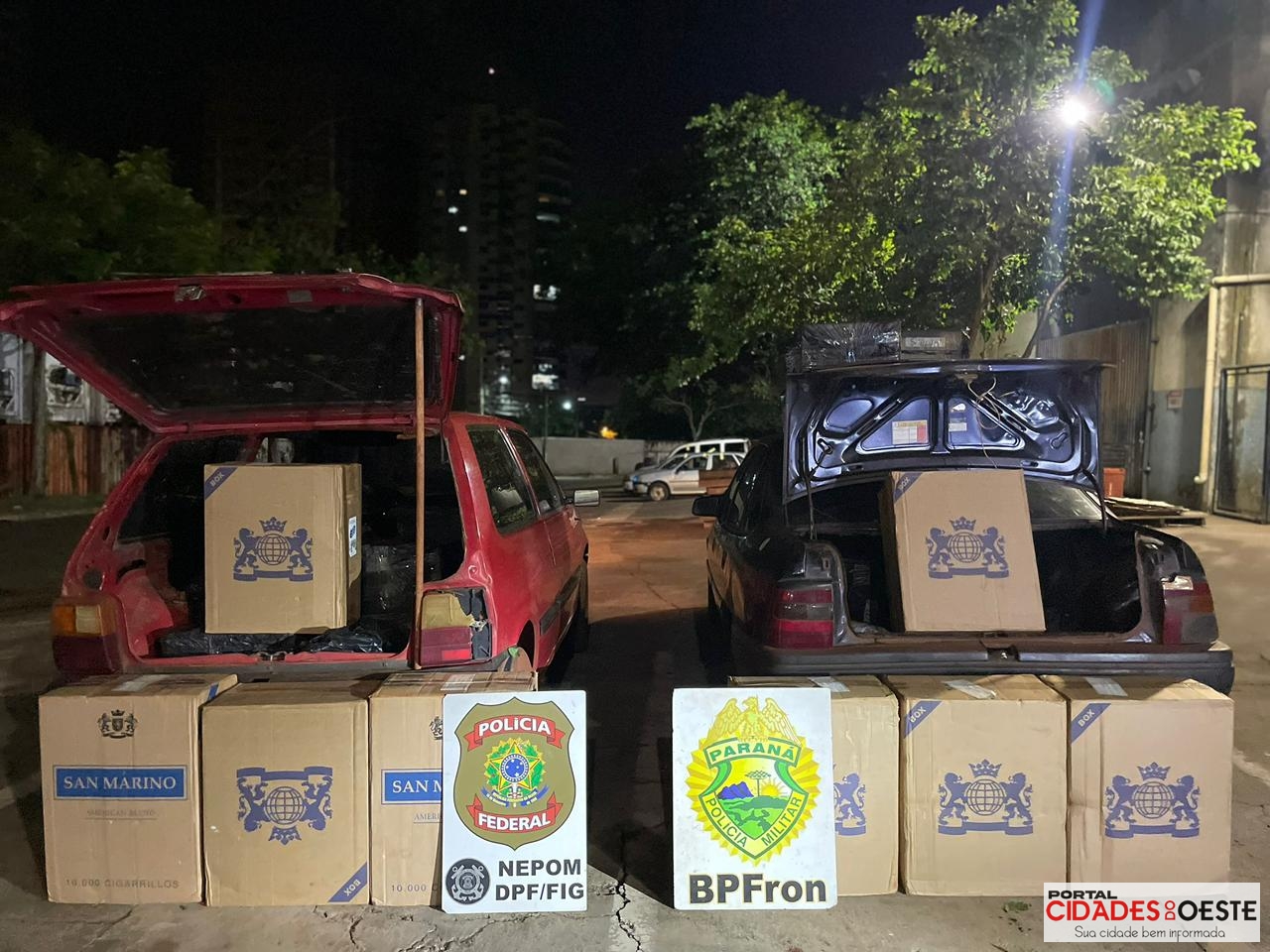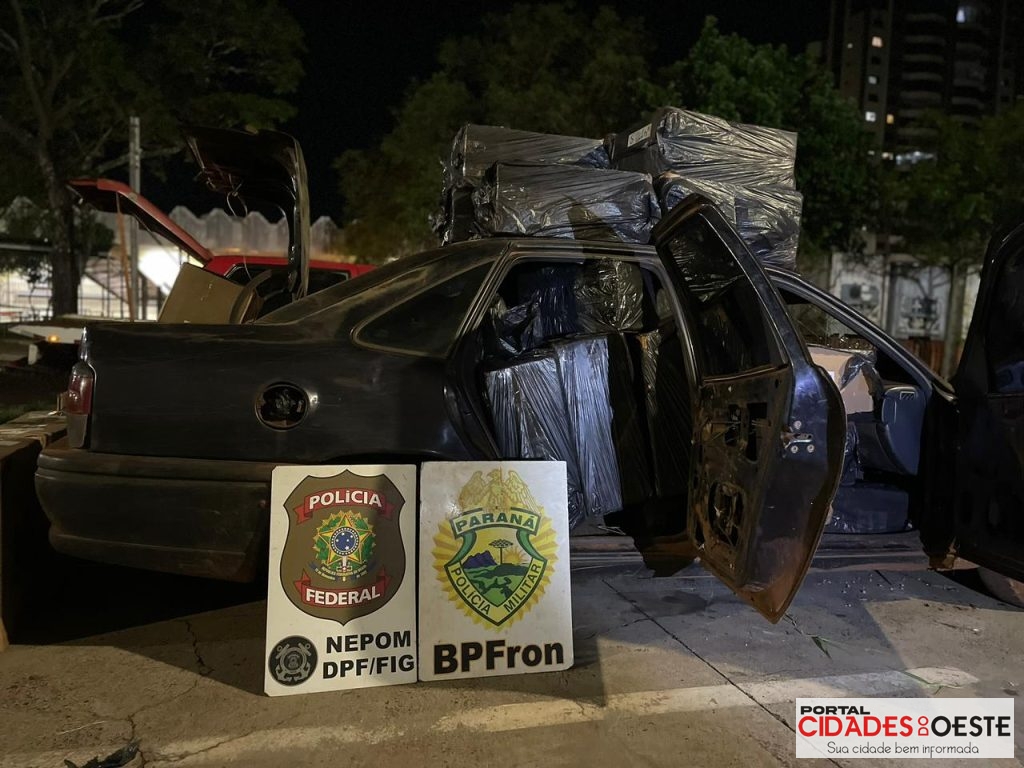 Na quarta-feira (14/01), a Polícia Militar do Paraná, por meio do Batalhão de Polícia de Fronteira (BPFRON), no âmbito da Operação Protetor de Divisas e Fronteiras, em ação integrada com a Polícia Federal – NEPOM, realizava patrulhamento na região da base náutica de Itaipulândia com o objetivo de averiguar denúncia de ilícitos transfronteiriços em portos da localidade. Durante a ação, a equipe obteve êxito em localizar dois veículos, um Fiat/Uno de cor vermelha e um GM/Vectra de cor azul, carregados com aproximadamente 60 (sessenta) caixas de cigarros contrabandeados do Paraguai, totalizando 3.000 (três mil) pacotes. Diante dos fatos, os dois veículos e a mercadoria apreendida foram encaminhados à Alfândega da Receita Federal de Foz do Iguaçu para os procedimentos cabíveis.