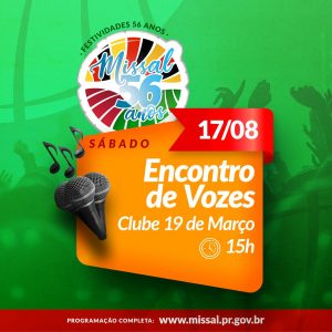 O Mês de julho foi repleto de atividades alusivas aos 56 anos de Fundação de Missal. O encerramento da programação será no dia 17 de agosto com o Encontro de Vozes, que deve reunir aproximadamente 400 coralistas de toda região e até de outros Estados. São 15 corais confirmados até o momento. O evento é aberto para a população prestigiar. Será no Clube 19 de Março com início às 15h.