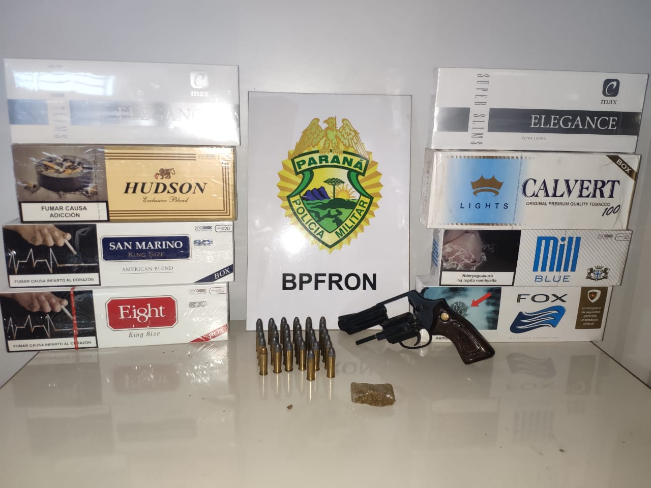 A operação resultou ainda em 185 pneus oriundos do Paraguai apreendidos, uma munição de fuzil 762, além 13 estojos de munições deflagradas de diversos calibres, 0,06 gramas de maconha, um carregador de pistola Glock com capacidade de 30 munições, um revólver calibre .38 municiado com 05 munições intactas, outras 33 munições calibre .38 além de 480 maços de cigarros contrabandeados do Paraguai.