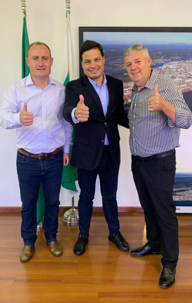 Zado e Egídio reuniram-se também com o Secretário de Infraestrutura e Logística, Sandro Alex, para apresentar o projeto do trevo de acesso para o Frigorífico, que será construído na Linha Novo Paraíso, às margens da rodovia PR-488.